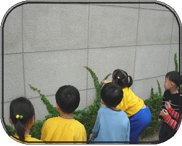 벽에 붙어 있는 담쟁이를 떼어보고 싶은 충동이 생긴 잎새반 유아들...