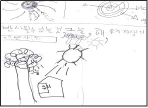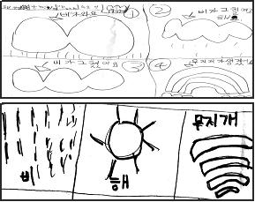 유아2: 반사는 햇빛과 물이 만나서 합쳐지는 거예요. 햇빛과 물이 만나면 반짝 거리면서 무지개가 만들어지거든요. 서로 만나서 무지개가 생기게 되는거 그게 반사예요.