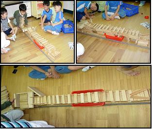 길이 끊어지는 것이 아쉬웠는지 길을 연결시켜 주는 매개체인 다리를 생각해 내고 다리 만드는 활동으로 연결되었다. 아이들이 그동안 많이 보아왔던 다리를 생각하며 조심스레 카프라를 만지는 손길이 진지해 보였으며 모양이 똑같지는 않지만 다리가 서 있게 되는 원리나 특성에 대하여 자연스레 생각해 보는 계기가 되었다.