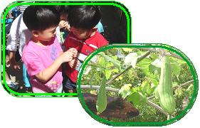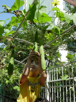 아직 덜 익은 수세미를 하나 따서 교실로 가져 왔다. 수세미 표면은 어떻게 생겼으며 느낌이 어떤지 직접 관찰하고 만져본다.