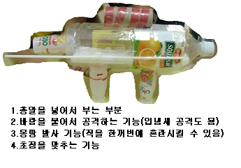 유아2:아! 나는 TV에서 다른 나라 사람들이 사냥을 할 때 쓰는 총을 봤는데, 그건 입으로 불어서 총알이 나가는거였어. 작지만 입으로 불면 동물을 잡을 수 있었어!