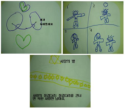 C3:그것도 몰라? 좋아하는거,그게 사랑이잖아.T:넌 좋아하는 것과 사랑하는 것이 같다고 생각하는구나!다른 친구들은 어때?