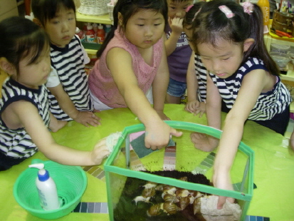 T : 그럼 달팽이를 잘 보이게 하려면 어떻게 해야 할까? C : 청소해야해요!! 깨끗이 해 주어야 해요! 그래서 잎새반 친구들과 함께 청소를 시작 하였다.