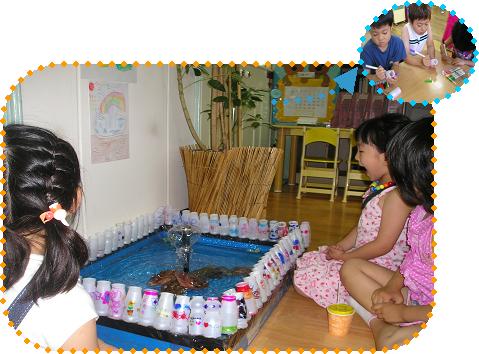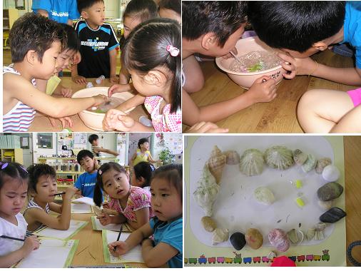 물에 뜨는 것과 가라앉는 것 그리고 물에 넣어도 썩지 않고 우리의 분수를 예쁘게 꾸며 줄 수 있는 것들을 말 이예요.우리 친구들의 이야기를 한번 들어보세요. “물에 뜨지 않고 가라앉는 것은 뭐가 있을까?” “돌이요.” “썩지 않고 예쁘게 꾸밀 수 있는 것은?” “조개랑 소라. 그리고 연꽃” “왜냐면 뿌리가 없는 건 다 시들어요.” 우리들이 만든 분수를 교실 앞에 놓아서 다른반 친구들도 예쁘게 볼 수 있도록 팻말도 꾸몄답니다. “하늘반 분수 보러 오세요. 하늘반이 그린 요쿠르트병으로 만들었어요.” “분수를 만지지 마세요. 그러면 고장이 날 수 있어요. 약속을 꼭꼭 지켜요.” “와~ 분수가 춤을 춘다” 한 친구가 말했어요. “선생님~ 춤추는 분수 같아요. 우리 노래 불러 줘요.” 그리고는 함께 노래를 불렀답니다. “나비야~ 나비야~ 이리 날아 오너라......”“선생님~ 저 이 빠졌어요. 이것 좀 보세요.”