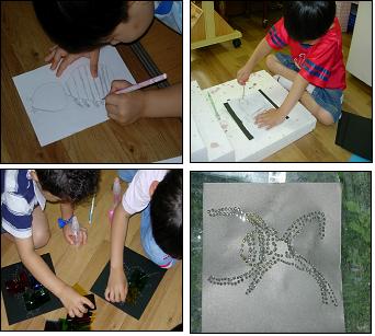 거미의 표상을 연필로 주로 하였더니 다른 도구보다도 자세한 표현은 되나 아이들이 지루해 하고 흥미가 떨어지는 듯 했다. 그래서 검은색 종이에 표현하는 새로운 방법을 제시해 보았다.