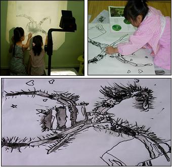 지난 번 아이들이 책에 있는 거미를 따라 그리기 한 것 중 잘된 거미 그림을 OHP필름지에 복사하여 OHP에 띄워 보았다. 아주 커다랗게 보이는 거미가 빛을 통하여 보니 정말 살아있는 듯하게 느껴 지기도 하고 느껴보기도 하고 아주 멋있어 보였다. 거미가 비추어진 곳에 하얀 전지를 붙이고 연필로 따라 그려보았다. 큰 거미의 윤곽이 나온것을 또 아이들과 함게 먹물로 따라 그려보았다.