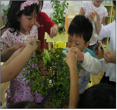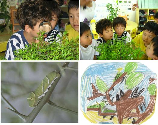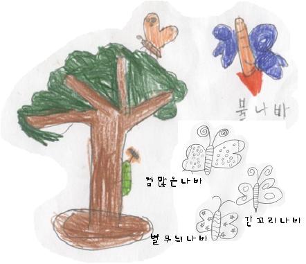 이런것 본적이 있나요? 애벌레가 기어가는 모습, 나뭇잎을 오물오물 먹는 모습, 응가 하는 모습과 그 애벌레 똥! 아~ 참! 그리고 애벌레를 손으로 만지지 마세요. 그럼 화가 난 애벌레가 노란 냄새뿔을 세우고는 고약한 냄새가 나는 액체를 뿜을지 몰라요.애벌레들은 허물을 벗고 조금씩 자라면서 나이를 먹어요. 이런 애벌레의 나이를 “령”이라 하지요. 호랑나비는 1령에서 4령까지는 애벌레의 몸이 온통 검은색과 갈색이에요. 마치 새 똥처럼 보이지요. 이것은 몸을 지저분하게 보여 다른 곤충들이 먹을 생각을 안게 하지요. 몸이 점점 커져 5령 애벌레가 되면 몸은 온통 초록색이고 머리에 둥그런 눈알 무늬와 줄무늬가 생기지요. 마치 뱀의 머리처럼 보이는데, 뱀으로 오해한 적들이 아예 다가오지도 못하게 하는 거예요. 우리들이 그린 나비 이름들을 들어보세요.-기계나비, 향기나비, 반사나비, 점박이나비, 졸라맨나비, 회오리나비, 연두나비, 호텔나비, 독수리나비, 줄무늬나비, 사랑이나비, 공룡나비, 하트나비민경: 난 집에서 배추 가지고 와야지. 동욱: 나도 가져와야지. 아~ 그리고는 잊고 있었는데 김장용 배추가 복도가 있는 거예요. 민우: 조리사님~ 배추 좀 주세요. 민주: 애들아~ 씻어서 줘야지. 모두들 애벌레에게 배추를 주지만 먹지를 않아요. 민승: 내가 지난번에 키워 봤는데 다른건 안먹던데. 나뭇잎만 먹는다. 순하: 아~ 나 이걸로(솜) 애벌레 집 지어줘야지... ^^ 그리고는 우리들은 애벌레의 이름도 지어줬답니다. 엉겅킹, 한돌이, 흰숭이, 징이, 스펀지밥, 나나, 뽀, 히순이, 뚱이, 정하, 징징이, 똥이, 네모, 뚱순이, 방귀쟁이, 예쁜이, 쫑이, 먹보, 복슬이, 똥싸개, 토순이, 스파니, 민스니 그중에서 제일 많은 친구들이 손을 든 뚱이와 징징이로 이름을 정했답니다. 집에갈땐 다정하게 인사도 해요. “뚱이야, 징징아 안녕~”