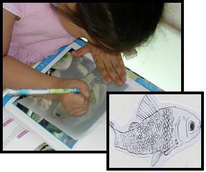 물고기도 거미처럼 실물 화상기로 책에 있는 물고기 사진을 비추어서 관찰하니 물고기의 생김새를 자세히 이야기 하지 못하였다. 책에 있는 물고기 사진을 직접 종이에 비추어 보며 따라 그리면서 비늘의 무늬, 아가미의 위치, 지느러미의 생김새 등 새로운 점에 대하여 알게 되었다.