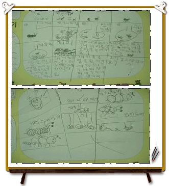 친구들은 그림을 그린 후에 다시 살펴보기로 했어요.종이를 받고 친구들은 한참 생각하는 모습을 보였어요. 알에서 시작을 할까? 애벌레에서 시작을 해야할까? 의견을 나누면서 그림을 그려나갔어요.