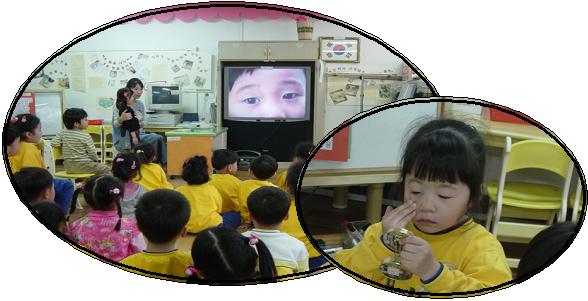 눈 관찰을 위해 한 유아의 눈을 실물화상기에 비춰 이야기를 나누었다.
