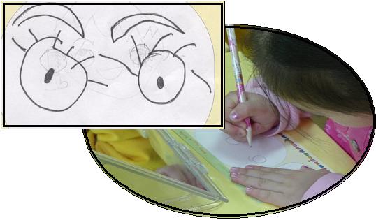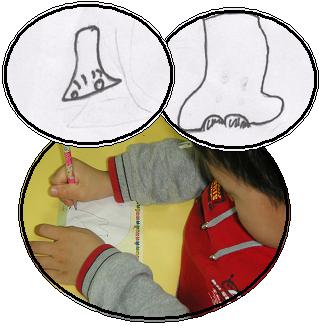 눈을 표상하는 부분에서 유아들이 어려워 하였지만 서로 서로 눈의 생김새가 다르다는 것을 알 수 있었다.< 코 표상 >