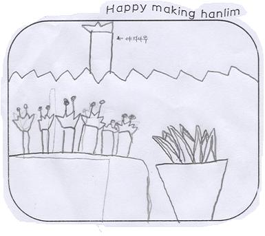 어?" "꽃이 마를까봐서요." "선생님~ 그런데 꽃이 물먹어요?" "글쎄~ 꽃한테 물어보지 그러니? " "에이~ 꽃은 사람이 아니잖아요." "그렇네~ 선생님도 물이 줄어드는건 봤지만 물 마시는건 못봤는데..." 어른들이 쉽게 그럴거라고 머리속으로 생각하고, 생각하고 있는 것들을 아이들은 어떻게 받아 들이는 걸까요? 내가 본 꽃을 그려 보기로 했답니다." 병원갈때 어머니랑 함께 본 나팔꽃도 그리고 우리집 안방에 있는 산세베리아도 그려보았어요. 멀리있는건 드라마에서 본 야자수예요."근린 공원에 산책을 갔어요? 두근두근 설레임... 과연 꽃이 폈을까요? "아~ 선생님~ 여기 보세요. 이것 꽃이 맞죠?" 어느새 돌담 밑에 풀꽃이 피었어요. 우리가 도착한 근린공원에는 산수유꽃, 매화꽃이 활짝 우릴 반겼답니다. "와~ 이거 개나리꽃 같다." "아니다. 이것봐~ 여기 뿌리 쪽에는 꽃이 없잖아~ 개나리는 여기서 부터 꽃이 피던걸..." 개나리는 노란색! 노란색은 개나리^^ 봄과 함께 우리 옆에 다가오고 있는 물감색을 쏙 닮은 듯한 꽃들이 다가오고 있어요. 예쁜 꽃들을 많이 많이 알아볼꺼예요.