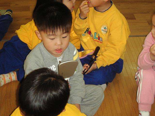 거울을 통해 자신의 얼굴을 보고 친구의 얼굴과 다른점을 서로 이야기 나누었다.