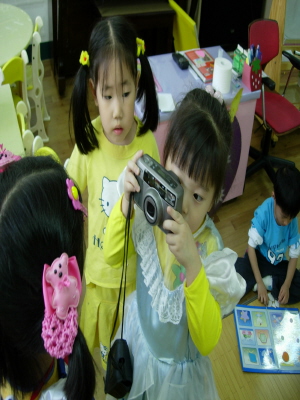 디지털 카메라로 사진을 찍어 확인하고 삭제도 가능하다는 것을 안 잎새반 아이들이 모두들 사진을 찍어서 자기 표정을 보여 달라고 궁금해 하였다. 그래서 친구의 표정을 서로서로 사진으로 찍어 주기로 하고 사진 찍기 놀이를 해 보았다.